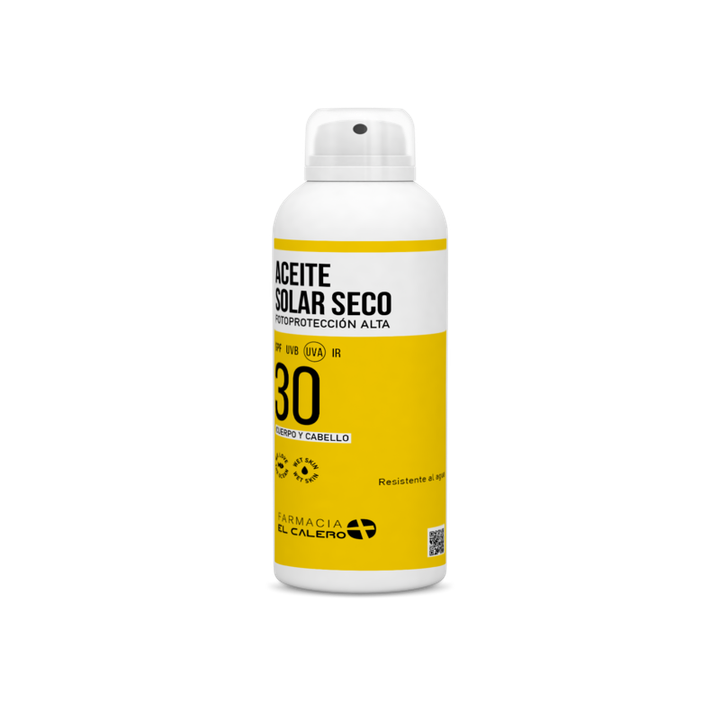 El Aceite Solar Seco SPF30 de Farmacia El Calero es un fotoprotector corporal que proporciona una protección eficaz frente a los rayos UVA y UVB mientras ayuda a mantener la piel hidratada y nutrida durante la exposición solar. Su fórmula combina filtros solares de amplio espectro con una textura de aceite seco, ligera y aterciopelada que se absorbe rápidamente sin dejar sensación grasa, aportando un acabado suave y satinado sobre la piel. Además, su fórmula contribuye a prevenir la sequedad cutánea y a proteger la piel frente a los efectos del sol, ayudando a mantenerla confortable y luminosa. Es resistente al agua y al sudor, lo que lo convierte en una opción práctica para actividades al aire libre y para disfrutar del sol con una protección adecuada. Su formato en spray facilita una aplicación rápida y uniforme sobre el cuerpo, proporcionando una sensación agradable y ligera sobre la piel. Se recomienda aplicar de forma abundante y uniforme antes de la exposición solar y reaplicar con frecuencia, especialmente después de nadar, sudar o secarse con una toalla, para mantener una protección óptima.