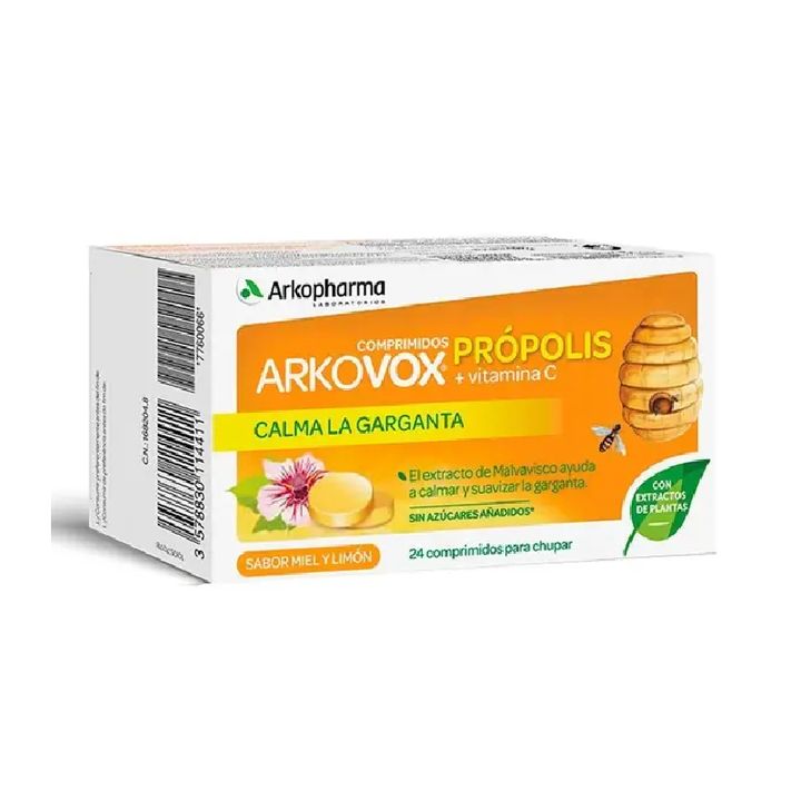 Arkovox Miel y Limón es un complemento alimenticio formulado a base de extracto de sumidad florida de erísimo, extracto de flor de matricaria, aceite esencial de eucalipto y mentol. Este producto cuenta con varios beneficios: el extracto de matricaria posee un efecto balsámico que ayuda a suavizar la garganta, la faringe y las cuerdas vocales; el extracto de erísimo suaviza la garganta y la voz ronca, facilitando la respiración; y el mentol aporta una sensación de frescor agradable y duradera.