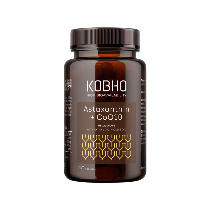 Kobho Astaxantina + CoQ10 es un complemento alimenticio antioxidante de alta potencia, diseñado para proteger las células frente al estrés oxidativo, favorecer la salud cardiovascular y contribuir al bienestar general. Su fórmula combina astaxantina (extraída del alga Haematococcus pluvialis), un pigmento natural de fuerte acción antioxidante, con coenzima Q10, esencial para la producción de energía celular y el buen funcionamiento mitocondrial. También incluye aceite de oliva virgen extra para mejorar la absorción, gelatina bovina, glicerina como humectante, y colorantes minerales (óxido de hierro negro y rojo). Se presenta en perlas, a razón de 1 cápsula diaria con la comida, lo que lo convierte en una solución práctica para incorporar en la rutina diaria.