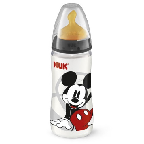El biberón Mickey Mouse First Choice combina los beneficios anatómicos de la forma de la tetina NUK con la sensación de estar en el seno materno. Permite alternar la lactancia materna y el biberón, reduciendo el riesgo de confusión o rechazo del pecho.
