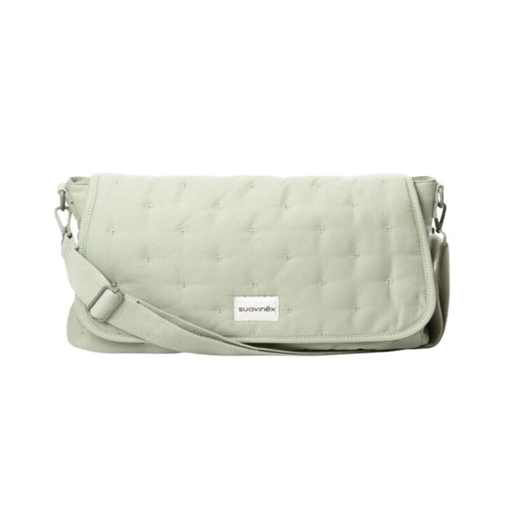 El bolso bandolera maternidad Poetry de Suavinex en color verde combina practicidad, comodidad y estilo, ideal para padres y bebés en sus salidas diarias. Su tejido resistente y fácil de limpiar, junto con su diseño compacto pero espacioso, permite organizar pañales, ropa de cambio, biberones, toallitas y otros accesorios de manera ordenada. Su asa larga permite llevarlo al hombro o colgado del carrito, adaptándose cómodamente al ritmo diario, ofreciendo funcionalidad y estilo en un solo bolso