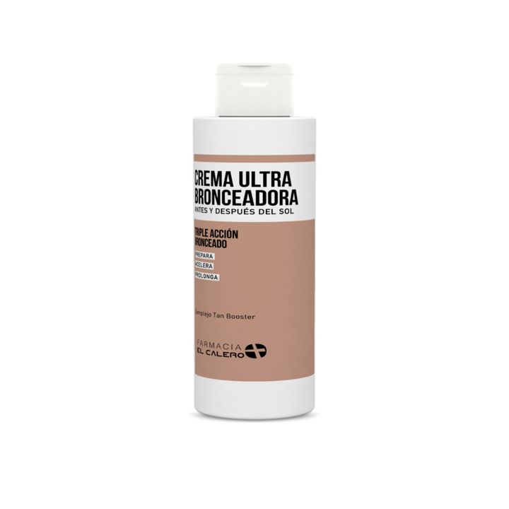 Crema Ultra Bronceadora 250 ml de Farmacia El Calero es un tratamiento corporal diseñado para preparar la piel antes de la exposición solar, intensificar el bronceado y ayudar a prolongarlo de forma uniforme y natural. Su fórmula actúa estimulando la síntesis de melanina, favoreciendo un bronceado más rápido, progresivo y luminoso tanto en rostro como en cuerpo. Además, aporta hidratación y confort a la piel, ayudando a mantenerla suave y nutrida durante todo el proceso de exposición al sol. Gracias a sus ingredientes activos y antioxidantes, contribuye también a contrarrestar el estrés oxidativo provocado por la radiación solar y a mantener la piel en buenas condiciones. Puede utilizarse antes y después del sol para preparar la piel, mejorar la calidad del bronceado y prolongar su duración, dejando un acabado suave y confortable. Se recomienda aplicar diariamente sobre la piel de rostro y cuerpo, comenzando su uso unas semanas antes de la exposición solar y continuando durante el periodo de exposición para potenciar y mantener un bronceado uniforme.