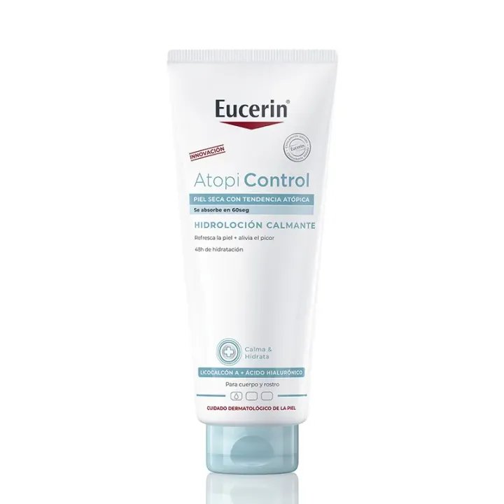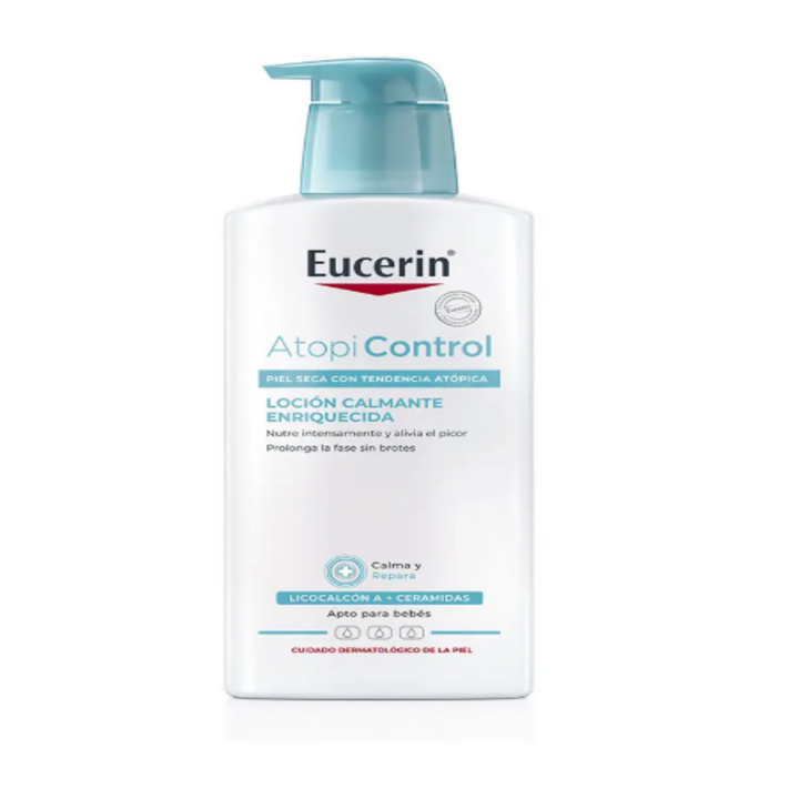 La Eucerin AtopiControl Hydro-Loción Calmante 400 ml es una loción corporal ultraligera desarrollada específicamente para pieles secas, sensibles o con tendencia atópica, que busca aliviar el picor y la irritación al mismo tiempo que hidrata de forma profunda. Su fórmula incorpora ingredientes clave como licocalcón A (un derivado del regaliz con acción antiinflamatoria y calmante), ácido hialurónico para retener agua y ceramidas que refuerzan la barrera cutánea, lo que ayuda a restablecer la protección natural de la piel y reducir la frecuencia e intensidad de brotes. Con su textura de rápida absorción, sin sensación grasa y apta para bebés, niños y adultos, esta loción se absorbe en cuestión de segundos, proporcionando hasta 48 horas de hidratación continua y una sensación de confort inmediato. Ideal para usar como parte de una rutina diaria de cuidado corporal en pieles atópicas o muy reactivas, tras la ducha o siempre que se necesite alivio y hidratación.