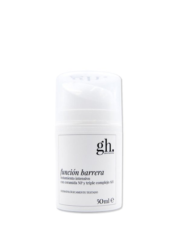 El GH Función Barrera Cremagel es un tratamiento intensivo diario, formulado en una textura cremagel ligera, adecuado para todo tipo de piel. Contiene un complejo de tres tipos de ácido hialurónico (AH): AH de alto peso molecular, que proporciona propiedades hidratantes; AH hidrolizado, que tiene efectos reafirmantes; y AH acetilado, que ofrece propiedades antiarrugas, antioxidantes, antipolución y reductoras de la rugosidad de la piel. Además, incluye dos ingredientes esenciales que mejoran la función barrera de la piel y favorecen la hidratación, elasticidad y sensibilidad cutánea: ceramida NP y un complejo lipídico omega 3, 6 y 9 de origen botánico. Su fórmula está enriquecida con manteca de karité (Butyrospermum parkii butter) y aceite de jojoba (Simmondsia chinensis seed oil).