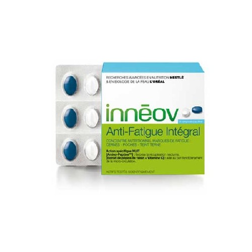 Innéov combate los signos de fatiga: bolsas, ojeras y tono apagado. Investigación avanzada en nutrición de NESTLÉ y en biología de la piel de L'ORÉAL. Acción específica noche.