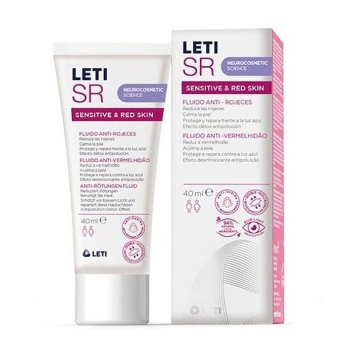 LetiSR Fluido Anti-Rojeces es un tratamiento facial diseñado para reducir, calmar y prevenir el enrojecimiento cutáneo en pieles sensibles, reactivas o con tendencia a la cuperosis y rosácea. Su fórmula avanzada combina extractos vegetales calmantes, niacinamida y ácido hialurónico, que fortalecen la barrera cutánea, mejoran la hidratación y disminuyen la sensación de calor y tirantez. Además, incorpora filtros solares SPF 20, que protegen la piel frente a los rayos UV, evitando la aparición de nuevas rojeces. De textura ligera, no grasa y de rápida absorción, deja la piel suave, uniforme y confortable durante todo el día. LetiSR Fluido Anti-Rojeces ofrece una acción completa para un rostro más equilibrado, hidratado y con menos rojeces visibles.