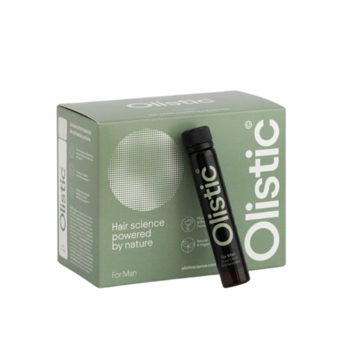Olistic Hombre es un complemento alimenticio de última generación diseñado específicamente para combatir la caída del cabello masculina desde el interior, actuando sobre las causas principales como el estrés, la inflamación, el déficit nutricional y el envejecimiento capilar. Su fórmula avanzada, 100% natural y libre de hormonas, combina más de 30 ingredientes activos de alta eficacia, entre los que destacan la biotina, el zinc, el selenio, el extracto de mijo, la vitamina D, la cúrcuma, el saw palmetto y antioxidantes como el resveratrol. Gracias a su formato bebible de uso diario, Olistic ofrece una absorción óptima y resultados visibles en densidad, fortaleza y vitalidad del cabello en tan solo 3 meses.
