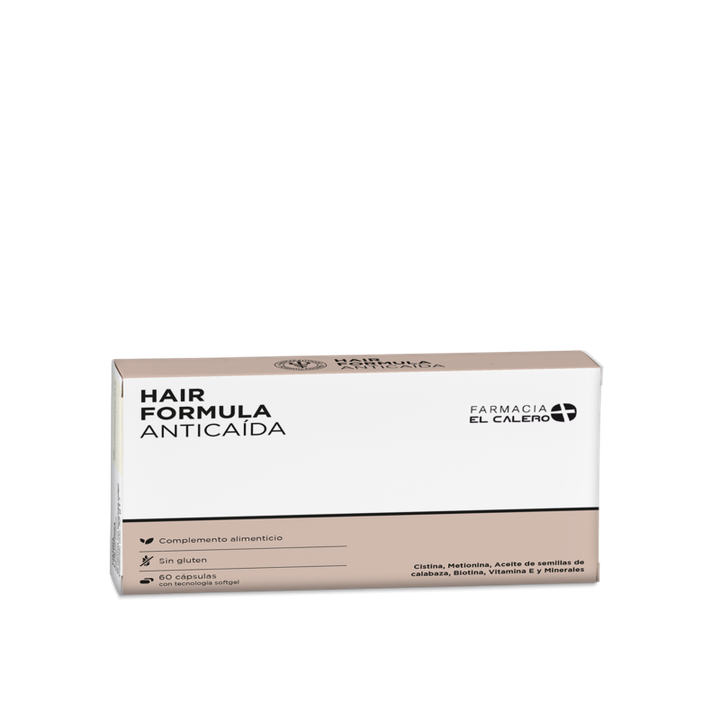Hair Formula Anticaída 60 cápsulas Farmacia El Calero es un complemento alimenticio diseñado para apoyar la salud del cabello y las uñas desde el interior, ayudando a reducir la caída capilar mediante una combinación de vitaminas, minerales y aminoácidos esenciales. Aporta nutrientes que participan en la formación de queratina y protegen frente al estrés oxidativo, contribuyendo a un cabello más fuerte y resistente. Se recomienda tomar 1–2 cápsulas al día con un vaso de agua, preferiblemente con las comidas, como parte de la rutina diaria de cuidado capilar. Composición: aceite de semillas de calabaza (Cucurbita pepo), L‑cistina, L‑metionina, biotina, vitamina E (acetato de alfa‑tocoferol), zinc, cobre y selenio, con base de aceite de semillas de soja y gelatina, y excipientes como lecitina de soja y glicerol.