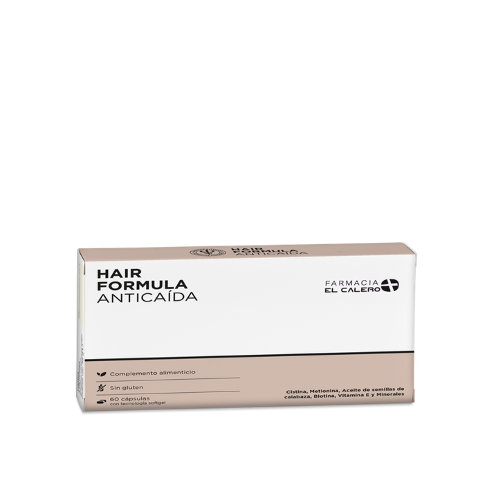 Hair Formula Anticaída 60 cápsulas Farmacia El Calero es un complemento alimenticio diseñado para apoyar la salud del cabello y las uñas desde el interior, ayudando a reducir la caída capilar mediante una combinación de vitaminas, minerales y aminoácidos esenciales. Aporta nutrientes que participan en la formación de queratina y protegen frente al estrés oxidativo, contribuyendo a un cabello más fuerte y resistente. Se recomienda tomar 1–2 cápsulas al día con un vaso de agua, preferiblemente con las comidas, como parte de la rutina diaria de cuidado capilar. Composición: aceite de semillas de calabaza (Cucurbita pepo), L‑cistina, L‑metionina, biotina, vitamina E (acetato de alfa‑tocoferol), zinc, cobre y selenio, con base de aceite de semillas de soja y gelatina, y excipientes como lecitina de soja y glicerol.