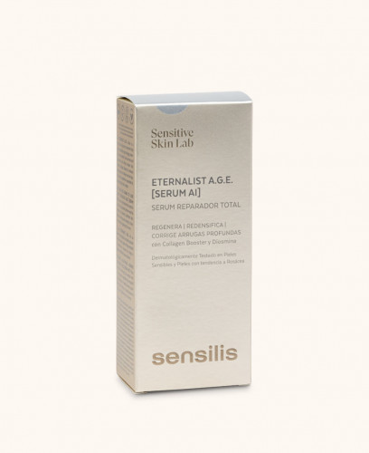 Con el paso de los años, se intensifica el proceso de la glicación en la piel. Por ello, Sensilis presenta el único sérum reparador antiedad total, un tratamiento completo antiglicación que repara en profundidad los signos de la edad, redensifica, remodela los volúmenes faciales y alisa la piel. Es ideal para pieles con tendencia a rosácea, cuperosis y/o pieles sensibles. Modo de empleo: Coloca encima del dorso de la mano tres cantidades de sérum del tamaño de un guisante. Realiza un masaje ascendente con ligeros toques en las zonas de los pómulos y mentón. En la zona de la frente, realiza un masaje desde el centro hacia los extremos.. Aplica ligeros toquecitos con las yemas de los dedos en la zona cercana al contorno de ojos y las sienes. . Masajea suavemente con el dedo índice la zona del labio superior y la barbilla.