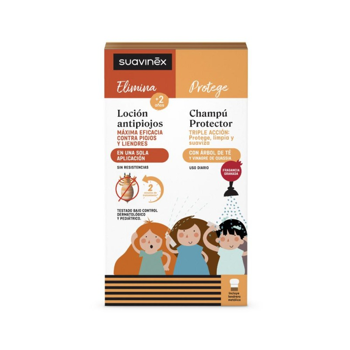 El Set Antipiojos Suavinex es un kit completo y seguro diseñado para eliminar piojos y liendres de forma eficaz, especialmente formulado para el cuidado del cabello y cuero cabelludo sensibles de los niños. Este set incluye una loción antipiojos con una fórmula que combina ingredientes activos como dimeticona, que actúa físicamente para asfixiar y eliminar los piojos, junto con extractos naturales que protegen e hidratan la piel sin causar irritación. Además, contiene glicerina y aceite de almendras dulces, que aportan nutrición y suavidad al cabello durante el tratamiento. El kit también incluye un peine especial de alta calidad para facilitar la eliminación mecánica de piojos y liendres, asegurando un tratamiento completo y efectivo. La loción tiene una textura ligera de rápida absorción que no deja residuos grasos y se aplica fácilmente sobre el cabello seco, ayudando a prevenir nuevas infestaciones. El uso conjunto de la loción y el peine ofrece un cuidado integral, promoviendo un cuero cabelludo sano y un cabello limpio, suave y libre de piojos. Se recomienda seguir las instrucciones del producto para garantizar los mejores resultados y mantener la tranquilidad y protección de toda la familia.