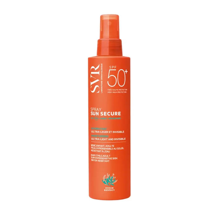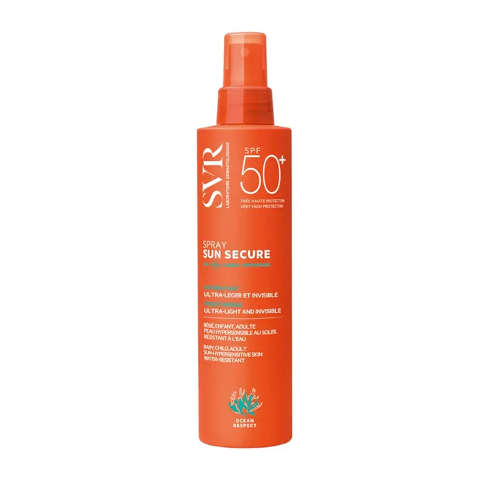 SVR Sun Secure Spray SPF50+ 200 ml es un protector solar en formato spray con textura ultraligera y acabado invisible que ofrece protección muy alta frente a rayos UVA, UVB, luz visible e infrarrojos gracias a una combinación de filtros fotoestables y antioxidantes como Detoxophane, beta-caroteno y niacinamida, su fórmula es biodegradable y respetuosa con el medio marino, no deja residuo blanco, es resistente al agua, sudor y roce, apto para todo tipo de piel, incluso sensibles, y puede usarse a partir de los 3 años tanto en rostro como cuerpo con aplicación fácil, rápida y sin sensación grasa.