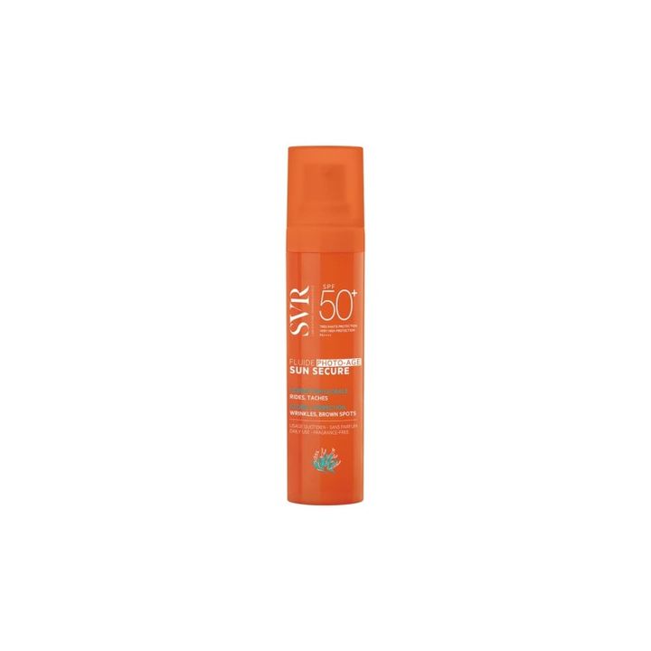 SVR Sun Secure Fluide Photo-Age SPF50+ 50 ml es un protector solar facial de amplio espectro que combina alta protección contra rayos UVA, UVB, luz visible e infrarrojos con activos anti-edad para prevenir y corregir los signos del fotoenvejecimiento. Su fórmula ligera y sin perfume es adecuada para pieles sensibles y proporciona una textura fluida de rápida absorción.