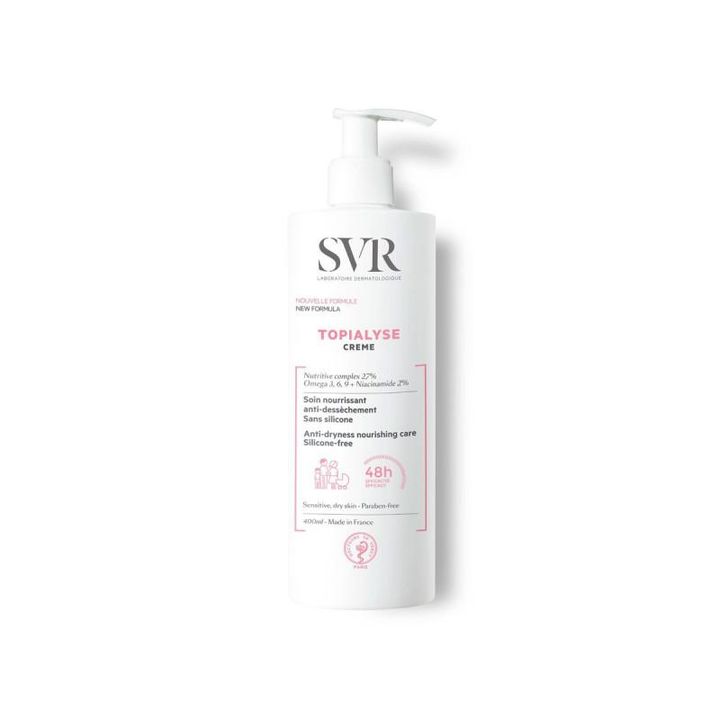 SVR Topialyse Baume Protect+ 400 ml es un bálsamo reparador y protector para pieles muy secas o atópicas. Su fórmula contiene un 98 % de ingredientes de origen natural y está enriquecida con una patente de ceramidas AD, que refuerzan la barrera cutánea frente a agresores ambientales como ácaros y contaminación. Incluye también azúcar prebiótico de Ophiopogon japonicus para calmar e hidratar, aceite de coco y manteca de babasú que nutren y suavizan la piel. Su textura nutritiva y relipidante se funde en la piel, creando una película protectora que evita la adherencia de partículas contaminantes. Es hipoalergénico, sin perfume, apto para toda la familia desde el nacimiento y probado bajo control dermatológico y pediátrico. Proporciona hidratación durante 48 horas y alivia el picor y la irritación, dejando la piel calmada, protegida y reparada.
